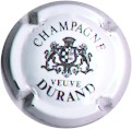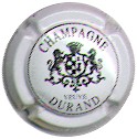 fond blanc, cercle noir, inscription noire "Champagne Veuve Durand", blason central noir patie gauche damier, partie droite tour crénelée surmonté d'une étoile, blason entouré de 2 lions et surmonté d'une couronne |