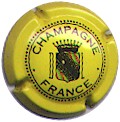 fond jaune, inscription noir "Champagne France", blason noir de champagne avec "D" et "L" de chaque côté, cercle noir bordé de points |