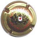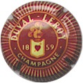 fond or, cercle or bordé de points, inscription rouge "Champagne Duval-Leroy", blason central or fond blanc avec un coeur rouge transpercé d'une flèche, entouré de feuilles de vigne, surmonté d'un heaume, et sous-titré "1859" |