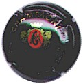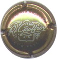 R. Geoffroy | noir (NR) /97-1-1 | fond noir, contour contenant liseré de feuilles de vigne argent, inscription argent "Champagne - Cumières", motif central argent représentant un blason contenant un vigneron stylisé, entouré de 2 grappes de raisins, traversé par une signature manuscrite "R. Geoffroy" |