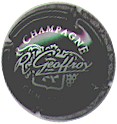 Gautherot | blanc 81-1-4 | fond blanc, cercle noir, inscription noire "champagne", dessin central noir représentant un personnage de carnaval tenant un masque dans sa main gauche et une flûte de champagne dans sa main droite, traversé par une inscription noire entourée de 2 traits "Gautherot" |