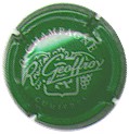 R. Geoffroy | vert (NR) /97-1-1 | fond vert, contour contenant liseré de feuilles de vigne argent, inscription argent "Champagne - Cumières", motif central argent représentant un blason contenant un vigneron stylisé, entouré de 2 grappes de raisins, traversé par une signature manuscrite "R. Geoffroy" |