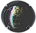 Germain | Vert foncé et or 83-1-2, lettre etroites (NR) /(24) | fond vert foncé, inscriptions or lettres étroites "Champagne Reims GERMAIN depuis 1898", blason or en haut avec 2 lettres enlacées "H" et "G" autour d'une coupe de champagne, entouré de 2 lions couronnés et surmonté d'une couronne |
