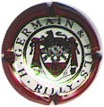 H. Germain & Fils | rouge et blanc Rilly 82-2-6 /(20) | contour rouge foncé, cercle bordé liseré or entouré noir fond blanc avec inscriptions noires "H. Germain & Fils - Rilly", blason central 3 parties, haut fleurdelisé or sur fond strié bleu, centre rameaux or sur fond blanc, bas initiales entrelacées "G" et "H" sur fond rouge. le blason est surmonté d'un lion et est posé sur un rideau intérieur blanc et extérieur rouge foncé avec franges et collerettes or. |