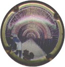 Gosset | vue des caves (27) | contour or contenant l'inscription noire "Champagne Gosset Aÿ depuis 1584", motif central multicolore représentant une vue des caves voutées avec un vigneron |