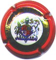 George Goulet | rouge et or 86-1-3 /(12) | contour rouge, cercle or bordé bleu avec inscriptions bleues "Champagne George Goulet", blason central multicolore, découpé en 4 (HG et BD 3 léopard bleus sur fond rouge, HD lion bleu sur fond or, BG drapeau rouge et bleu sur fond blanc), surmonté d'un heaume et entouré par un lion à gauche et un serpent à droite or |