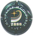 H. Goutorbe | cuvée A2K polychrome 87-1-4 /103-1-6 | fond vert, inscription blanche "Champagne H. Goutorbe - Aÿ", motif central orange, gris et blanc représentant la comète et sa queue soulignée par l'inscription "2000" |