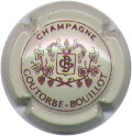 Goutorbe-Bouillon | crème et bordeaux 87-1-1 /103-1-3 | fond crème, cercle bordeaux, inscription bordeaux "Champagne - Goutorbe-Bouillon", blason central bordeaux contenant les initiales enlacées "GB", entouré de 2 branches de vigne et surmonté d'une heaume |