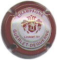 Guerlet-Deguerne | bordeaux 88-2-6 /104-1-4 | contour rouge, cercle blanc bordé or contenant l'inscription bordeaux "Champagne Guerlet-Deguerne", blason central or et bordeaux sur fond blanc, contenant les lettres enlacées "D" blanche et "G" or, sur un rideaux blanc bordé rouge et or fleurdelysé, souligné par l'inscription bordeaux "Chamery" |