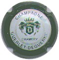 Guerlet-Deguerne | vert foncé 88-2-6 /104-1-4 | contour vert foncé, cercle blanc bordé or contenant l'inscription verte "Champagne Guerlet-Deguerne", blason central or et vert sur fond blanc, contenant les lettres enlacées "D" blanche et "G" or, sur un rideaux blanc bordé vert et or fleurdelysé, souligné par l'inscription bordeaux "Chamery" |