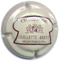 Guillette-Brest | crème 89-1-6 /105-2-5 | fond crème, cartouche central contour marron en forme de bouchon de champagne contenant l'inscription marron "Champagne - Guillette-Brest - Monthelon" et un blason marron reprenant les armes de Champagne entouré de 2 lions et surmonté d'une couronne |