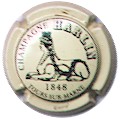 fond crème, cercle noir,, inscription noire "Champagne Harlin - 1848 - Tours-sur-Marne" avec Harlin en lettres doubles, motif central noir représentant un sphinx |