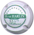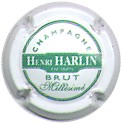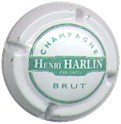 fond blanc, cercle vert, inscription verte "Champagne - Brut", bandeau central vert contenant l'inscription blanche "Henri Harlin Reims" |