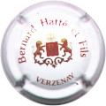 fond blanc, inscription rouge "Bernard Hatté & Fils - Verzenay", blason central fond rouge contenant initiales enlacées or "B" et "H", entouré de 2 lions et surmonté d'une couronne |