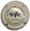 fond crème, cercle noir, inscription noire "L. Hautem-Concé - champagne - Villiers-Marmery", motif central noir représentant une branche de vigne avec feuilles et grappes de raisins |