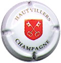 fond blanc, inscription lettres larges or "Hautvilliers Champagne", blason central bistre avec 2 clés croisées or |