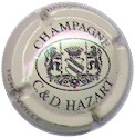 fond crème, contour contenant 3 fois l'inscription "Hermonville", inscription noire "Champagne C & D Hazart", ovale allongé noir contenant un blason noir avec armes de Champagne, entouré de 2 lions avec lances et surmonté d'une couronne |