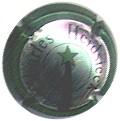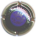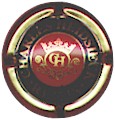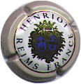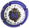 contour bleu, cercle or bordé noir, inscriptions noires "Henriot - Reims - France", blason central or et bleu contenant 2 ovales bleu (G 2 étoiles or et un croissant ouvert vers le haut, D 3 étoiles or séparées par un liseré constitué de 3 lignes de points entouré de 2 lignes pleines), blason entouré de feuilles et surmonté d'une couronne |