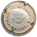 contour or, cercle crème bordé marron clair, contenant inscription marron clair "Charles Heidsieck - Reims", blason central marron clair sur fond bleu clair contenant les initiales enlacées "C" et "H", surmonté d'une couronne et entouré de fioritures |