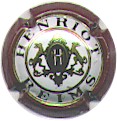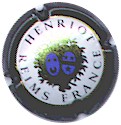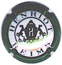 contour vert, inscriptions noires "Henriot - Reims" entourées de 2 cercles or bordés noir, blason central or et gris, contenant les initiales "H" et "M" enlacées, soutenu par 2 chiens |