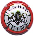 contour rouge, inscriptions noires "Henriot - Reims" entourées de 2 cercles or bordés noir, blason central or et gris, contenant les initiales "H" et "M" enlacées, soutenu par 2 chiens |