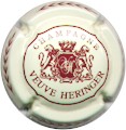 contour crème contenant motif feuilles de laurier bordeaux, fond crème, cercle bordeaux, inscription bordeaux "Champagne veuve Heringer", blason central bordeaux contenant initiales manuscrites enlacées "V" et "H", entouré de 2 lions et surmonté d'une couronne |