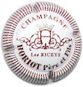 contour blanc strié marron, fond blanc, inscription marron "Champagne Horiot Père & Fils - Les Riceys", grande lettres centrale enluminée "H" surmontée d'une couronne et entourée d'enluminures |
