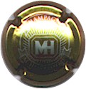 contour or, fond blanc, inscription verte foncée "Marc Hebrart - Champagne - Mareuil sur Aÿ", blason central vert et marron foncé ovale contenant les lettres "MH", surmonté d'une couronne |