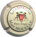 fond crème, cercle noir, inscription noire "Champagne Marc Houelle - Passy-Grigny", blason central fond rouge contenant lettre "H" blanche entouré de 2 lions et surmonté d'une couronne |