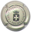 fond crème, cercle noir, inscription noire "Comte Hugues des Ouches - Polisy", blason central noir et crème contenant une croix, surmonté d'une couronne |