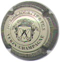 fond rosé, inscription noire "Hirier-Jouette - Verzy - Champagne", cercle noir, blason central noir contenant un "V" traversé par 2 comètes de Halley, entouré de grappes de raisins et surmonté de remparts |