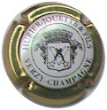 contour or, fond blanc, inscription noire "Hirier-Jouette - Verzy - Champagne", cercle noir, blason central noir contenant un "V" traversé par 2 comètes de Halley, entouré de grappes de raisins et surmonté de remparts |