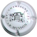 fond blanc, inscription noire "Champagne J.P. Husson" séparés par 2 points entourant la ville "Aÿ", motif central noir représentant l"entrée de pierre d'une propriété bourgeoise. |