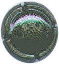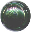 fond vert, cercle or, inscription or "Champagne Janisson - Chigny les Roses", motif en haut à gauche représentant un bouquet de 3 roses bleues, feuilles or |