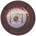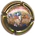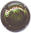 fond marron cercle or, inscription or "Champagne", blason central or contenant une croix marron bordé or sur fond strié, entouré d'un branchage et de gouttes d'eau, dans un écusson parchemin surmonté d'une couronne |
