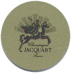 cuvée Mosaïque - fond rosé, cercle noir strié en haut du contour, cavalier noir sur cheval ailé, jouant de la trompette, inscription centrale noire "Jacquart", inscription manuscrite noire "La Cuvée Mosaïque" |
