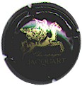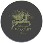 fond noir, inscriptions or "Champagne Jacquart - Reims" avec le "Q" de Jacquart sur le "R" de Reims, cavalier or sur cheval ailé, jouant de la trompette |