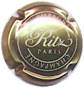 fond or, cercle or bordé blanc avec inscriptions blanches Champagne - Champagne", au centre, inscriptions manuscrites blanches "Ritz - Paris" |