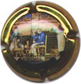 contour noir, centre fond or, inscription noire basse "Champagne Jorez-Lejeune - Ludes", motif or et noir représentant une cave voutée dans laquelle un moine porte du raisin |