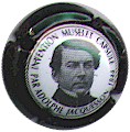 contour noir, centre blanc avec inscription noire "invention muselet capsule par Adolphe Jacquesson 1844", portrait de A. Jacquesson au centre |