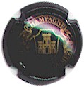 fond noir, cartouche haut inscription or pâle "Champagne", cartouche bas inscription or pâle "Jacquinet-Dumez", écusson central or sur fond noir contenant un donjon avec 3 tours, portes et fenêtres |