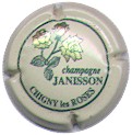 fond crème, cercle vert, inscription verte "Champagne Janisson - Chigny les Roses", motif en haut à gauche représentant un bouquet de 3 roses or, feuilles vertes |