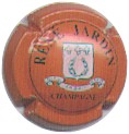 fond orange, cercle vert, inscription verte "René Jardin - Champagne", blason central vert et blanc contenant une couronne de laurier et 3 fleurs de Lys, légendé dans un ruban "Dieu en soit gardé" |