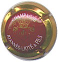 contour or, fond rouge, inscription blanche "Champagne Joannes-Lioté & Fils, blason central or contenant les initiales enlacées or "JL", entouré de 2 feuilles de vignes, et surmonté d'une couronne, |