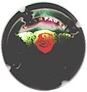 fond or, cercle noir, inscription noire "Champagne Janisson - Chigny les Roses", motif en haut à gauche représentant un bouquet de 3 roses rouges, feuilles noires |