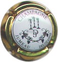 contour or, centre fond blanc-grisé, inscription noire "Champagne Jumeau-Delozanne", motif central noir représentant les initiales enlacées "DJ", entourées de branchages de vigne, et surmonté de 3 flûtes à champagne pétillantes |