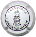 fond blanc, cercle noir, inscription noire "Champagne - Christian Jonot", motif central noir représentant un bacchus buvant du champagne assi sur un tonneau |