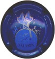 Salmon | Mongolfiades de la vallée de l'Ardre noire (NR) | fond noir, cercle noir entouré jaune contenant l'inscription jaune "1ères Mongolfiades de la vallée de l'Ardre", motif central représentant une croix souple jaune coupée en 2 par un trait bleu, le haut de la croix jouant le rôle de la lettre "V" dans le mot "Vallée" et le bas de la croix jouant le rôle de la lettres "A" dans le mot "Ardre", le tout étant donc une inscription bleu "Vallée de l'Ardre" |
