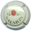 Salmon | crème 171-2-1 /201-2-4 | fond crème, cercle or, inscription or "Champagne Salmon", blason central or fond rouge contenant un vigneron récoltant le raisin, entouré de grappes de raisins et feuilles de vigne |