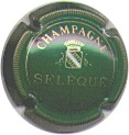 Sélèque | vert 173-1-2 /203-2-3 | contour vert strié or, fond vert, cercle or, inscription or "Champagne Seleque - Pierry", ecusson Champagne or et blanc entouré de 2 feuilles de vignes et surmonté d'une couronne |